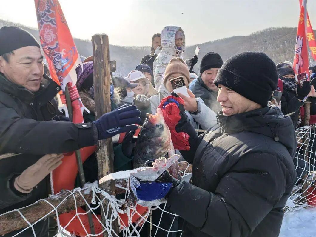 “今年的‘頭魚’有10多斤。”鏡泊湖水產養殖場漁業養殖帶頭人曹太友抱起“頭魚”,向圍觀人群展示這份來自冰湖之下的厚禮。“摸摸魚頭,新年好兆頭;摸摸魚背,順風又順水……”工作人員抱起剛出網的湖魚走向翹首以盼的人群,引發游客陣陣歡呼。現場展示過后,牡丹江市打破以往冬捕節拍賣“頭魚”的傳統,將象征吉祥與豐收的冬捕“頭魚”贈予全國勞動模范張瑞勇,向最美勞動者致敬。