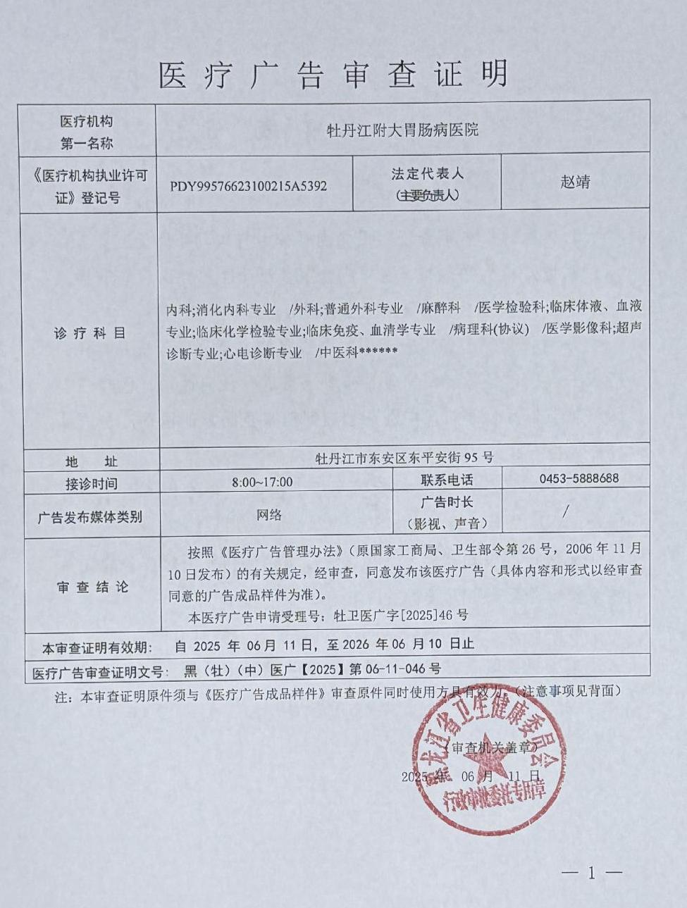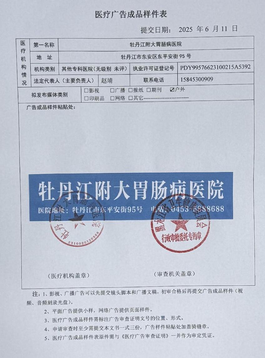 • 牡丹江附大胃腸病醫院-醫療廣告審查材料(戶外、網絡)