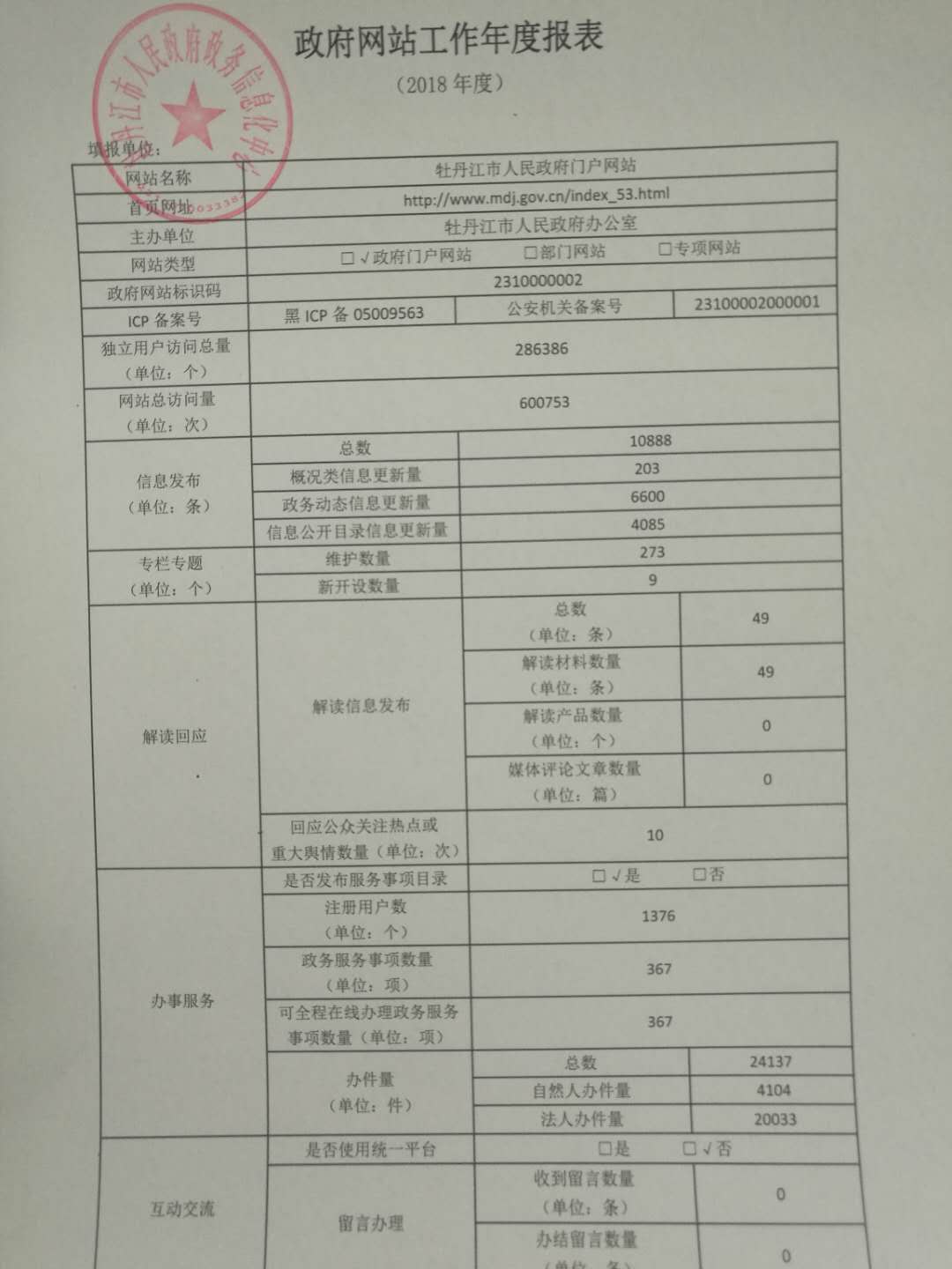 牡丹江市政府網站2018工作年度報表