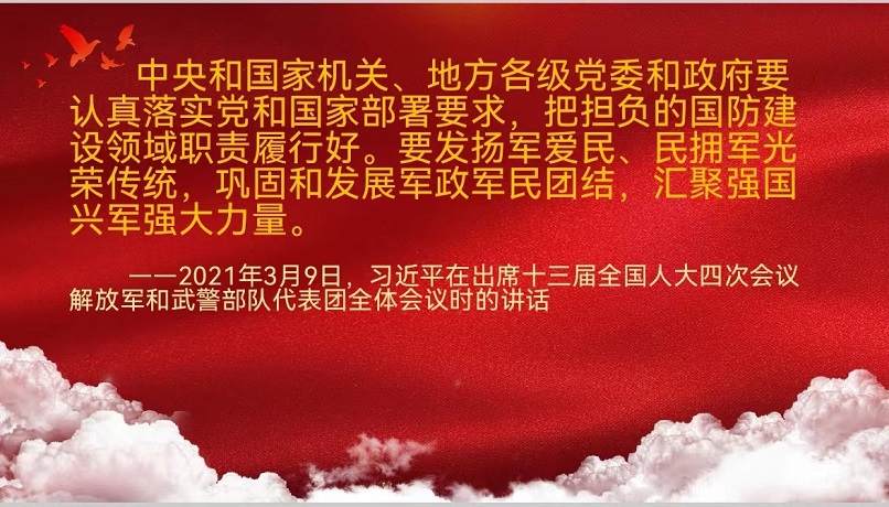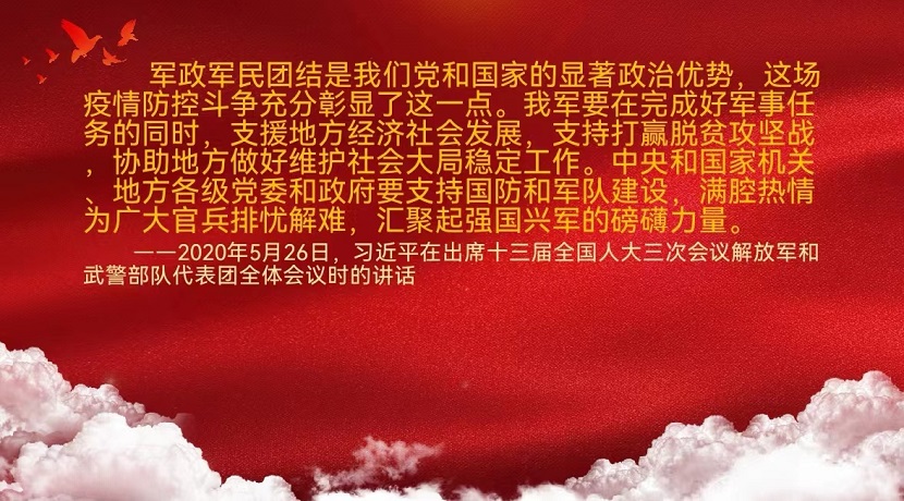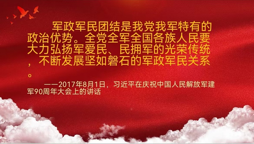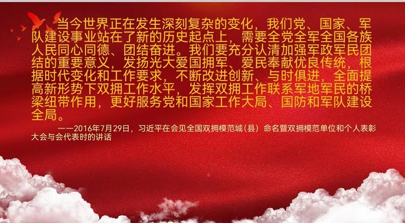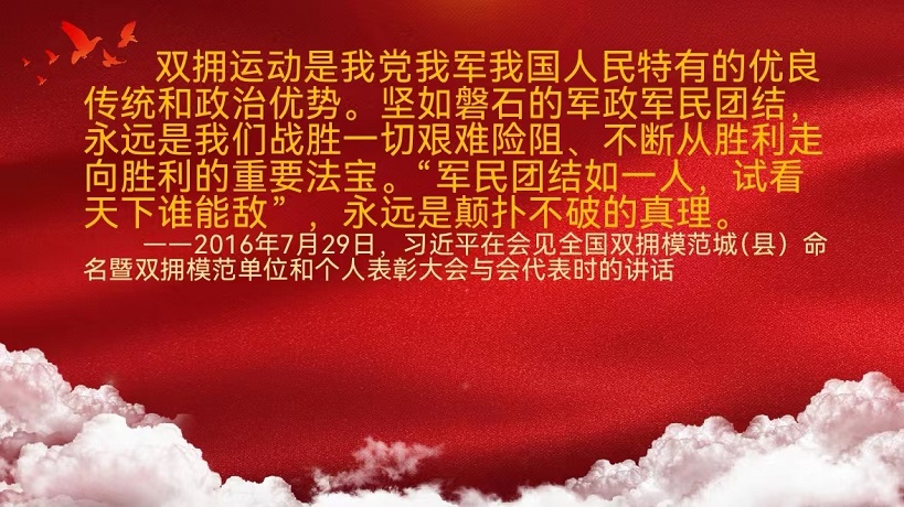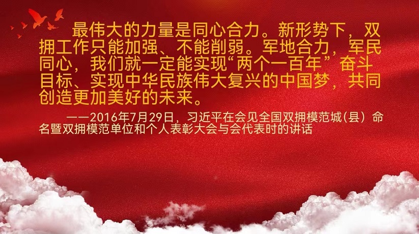 中共中央總書記、國家主席、中央軍委主席習(xí)近平深刻指出,雙擁運(yùn)動是我黨我軍我國人民特有的優(yōu)良傳統(tǒng)和政治優(yōu)勢。堅如磐石的軍政軍民團(tuán)結(jié),永遠(yuǎn)是我們戰(zhàn)勝一切艱難險阻、不斷從勝利走向勝利的重要法寶。