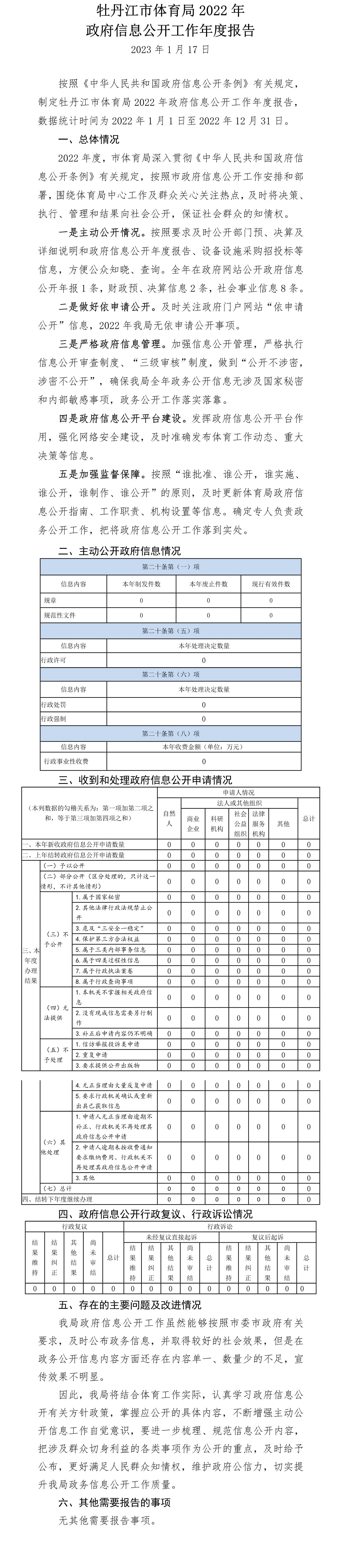 牡丹江市體育局2022年政府信息公開工作年度報告