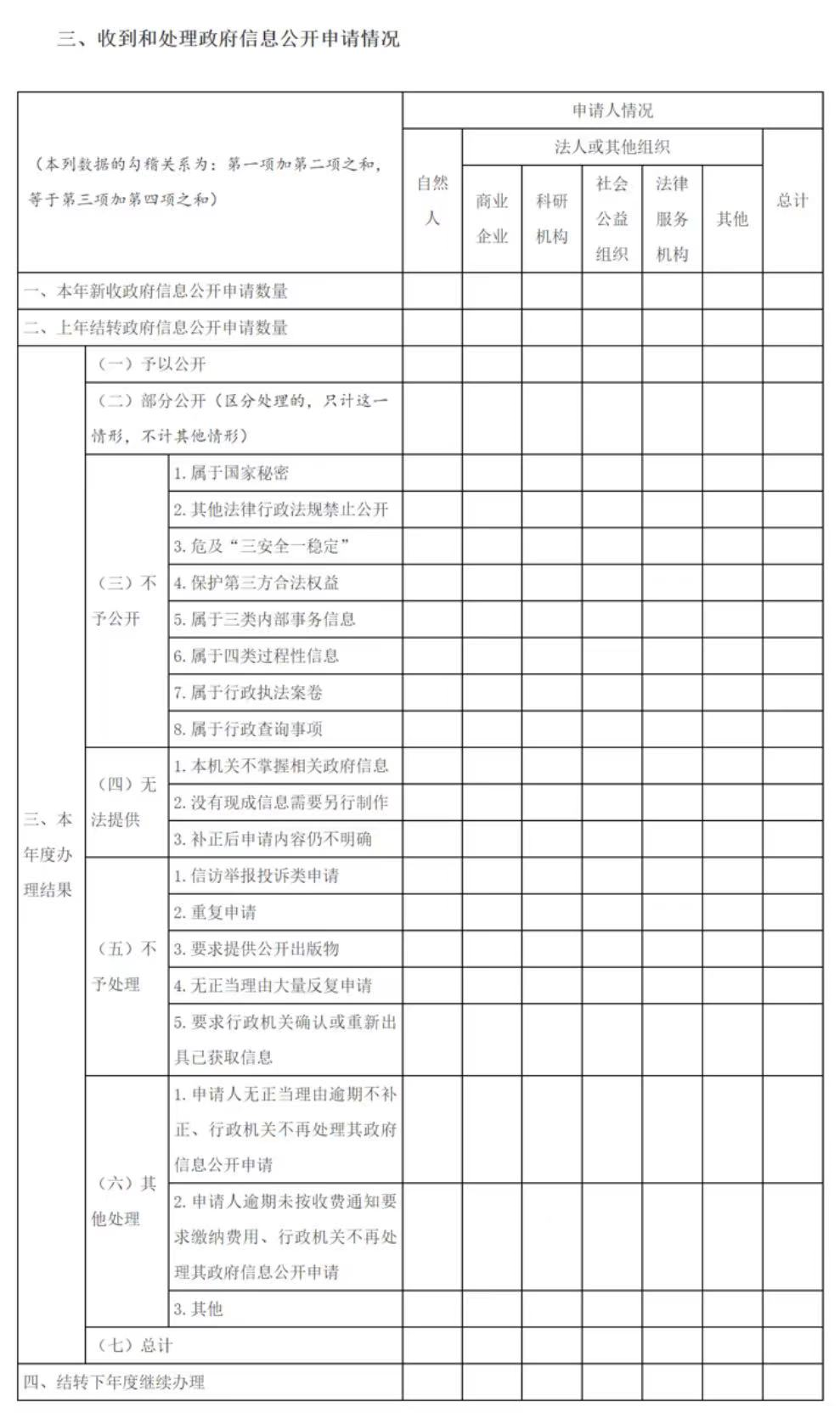 這一項主要報告兩方面情況:一是申請人的類別;二是政府信息公開申請的最終處理結果。此項內容重在數據準確、要素齊備,全面客觀反映政府信息公開申請接收和辦理情況,便于政府信息公開工作主管部門全面掌握工作動態,使社會各界了解政府公開透明進程。